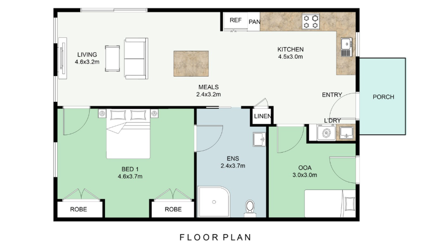 The spacious bedroom includes a private ensuite, offering privacy and personal space within a simple, functional design. Accessible features are thoughtfully incorporated throughout the villa to support ease of movement and long-term liveability, helping you feel confident and comfortable in your home.